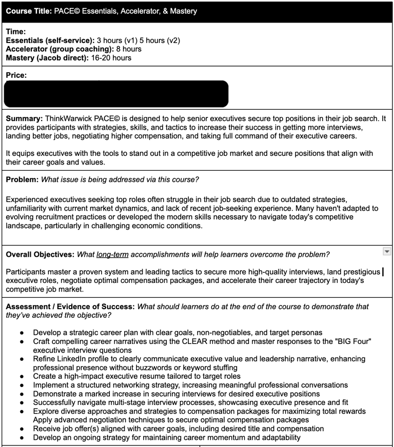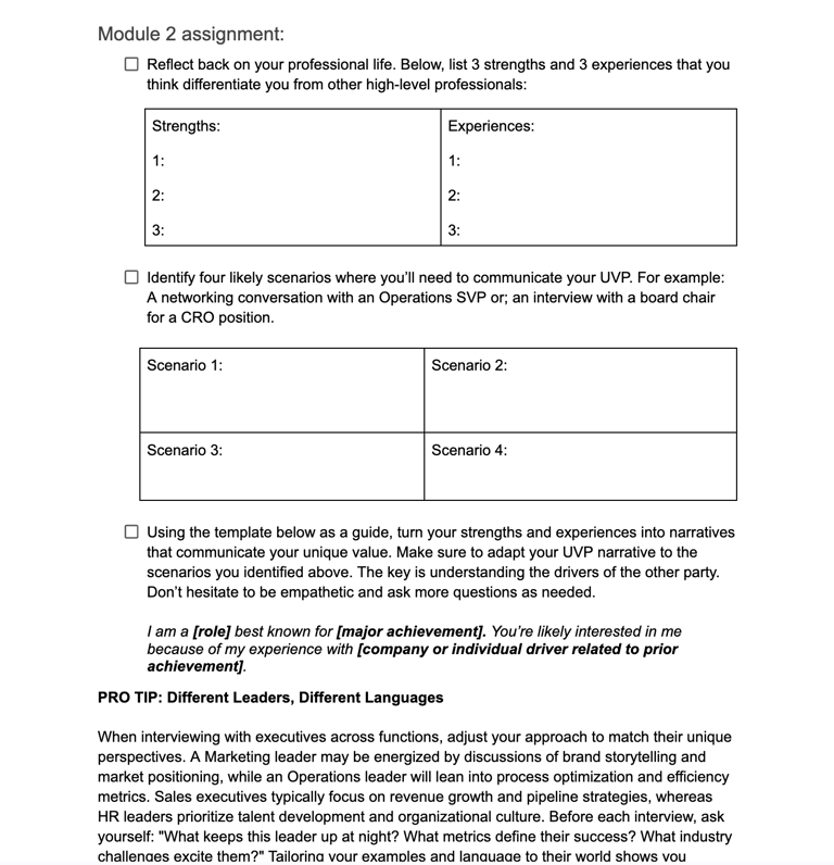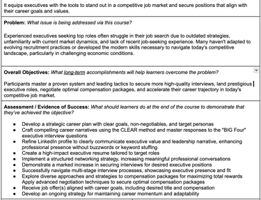 Transform years of C-suite career coaching content—webinars, lectures, blog posts—into cohesive self-paced learning experience.